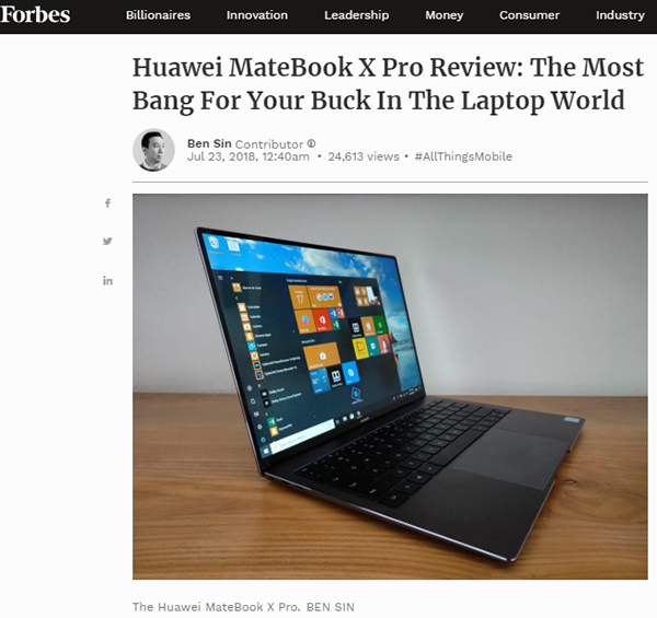 据《福布斯》资深记者Ben Sin报道,华为MateBook X Pro笔记本质量过硬、设计高端,物超所值,无疑是消费者换机的最佳选择。