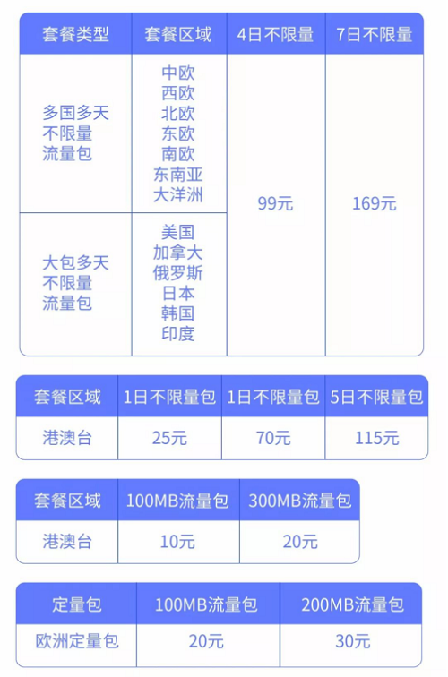 从2018年6月1日开始,中国电信推出多款多天流量包,专为在不同国家、地区间的多天旅程而设计,包含欧洲、大洋洲、美国、加拿大、俄罗斯、日本、韩国、印度、东南亚(新、马、泰、印尼、柬埔寨)等方向,4日包99元、7日包169元,比单日封顶更便宜!另外还有港澳台三地和欧洲多款特色流量包,最低每日23元,让出境游省钱更省心!