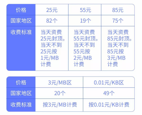 目前,在全球176个国家和地区,中国电信以25元区、55元区和85元区划分,实行费用封顶,数据流量不限量的收费标准。