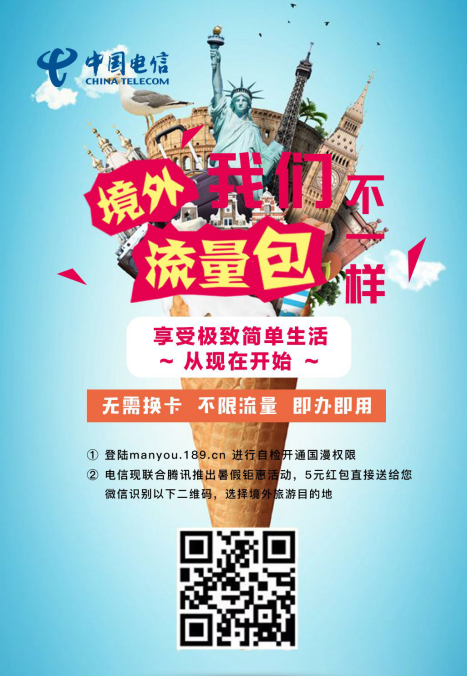 国际漫游业务开通和详细信息,请前往营业厅或拨打10000,或登录http://manyou.189.cn,获取更多国际漫游信息。你也可以关注“中国电信国际漫游”微信公众号,了解国际漫游的最新资讯,获取更多优惠!