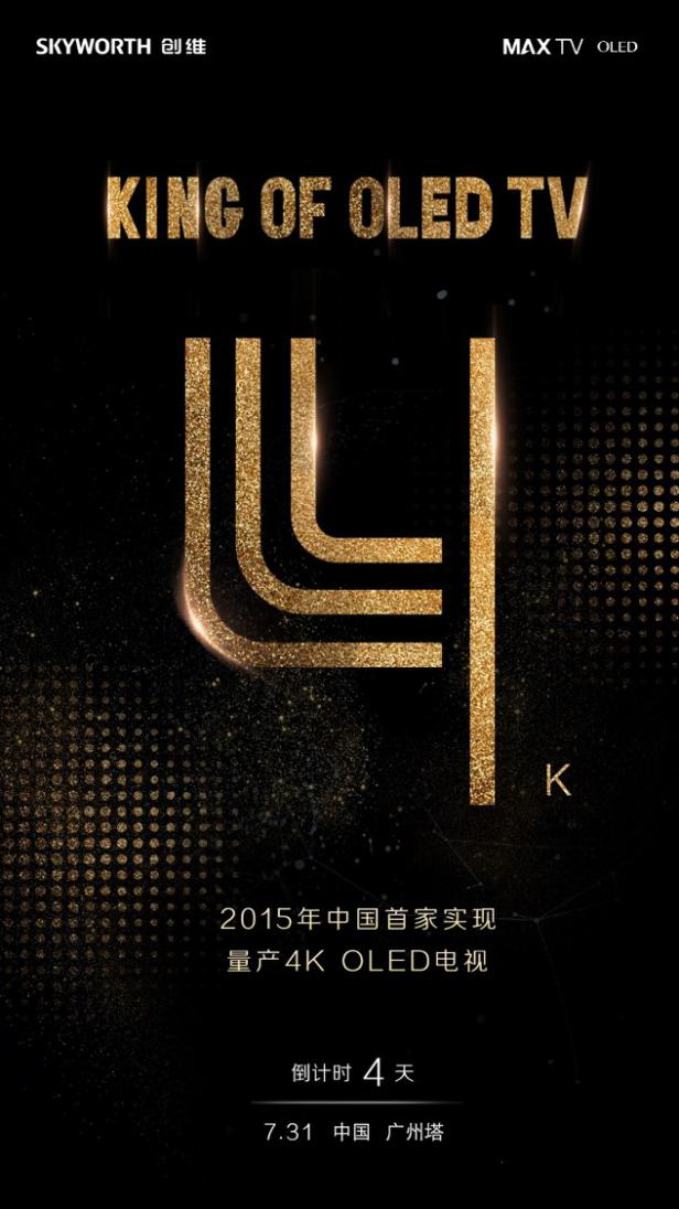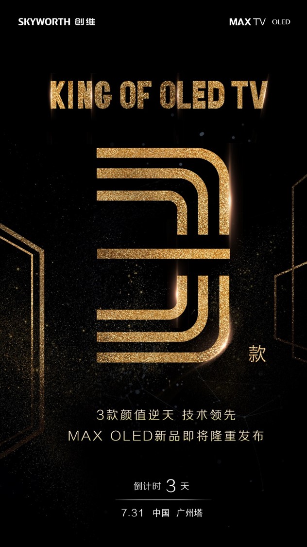 仔细研究创维发布会倒计时海报:设计风格一如既往的简约大气,璀璨的星空背景布局满是科技感,若隐若现的电视屏幕边框富有想象空间,金色条纹的倒计时数字赫然而立,主文案“KING OF OLED TV”霸气十足。