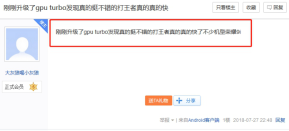 在荣耀9i陆续升级GPUTurbo技术的过程中,不少网友表示,升级GPUTurbo后荣耀9i性能提升不少,主要体现在游戏体验、耗电量和发热程度三个方面。网友大灰狼喝小灰狼认为,荣耀9i升级GPUTurbo后,玩《王者荣耀》的速度快了不少;其他网友认为,升级GPUTurbo后,荣耀9i的游戏耗电量有所减少,虽然效果不少很明显;还有网友亲测后表示,荣耀9i升级GPUTurbo后,荣耀9i在室内没有开空调的环境中,玩半小时刺激战场后,机身背部温度为38.4度,和其他千元机相比,温度已经控制得相当不错。