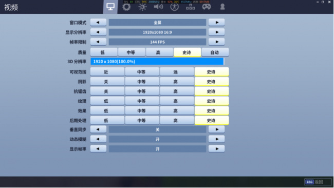 游戏画质画质设置:史诗画质,同时设置帧率限制为144fps,1080P全屏状态,可视范围、阴影、抗锯齿、纹理和效果、后期处理等都选择最高的史诗级别。