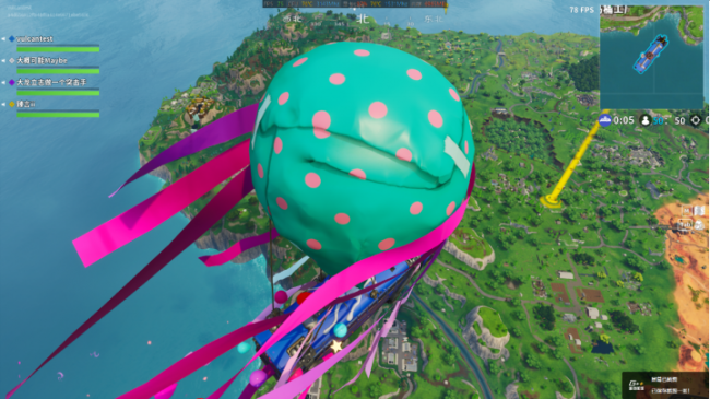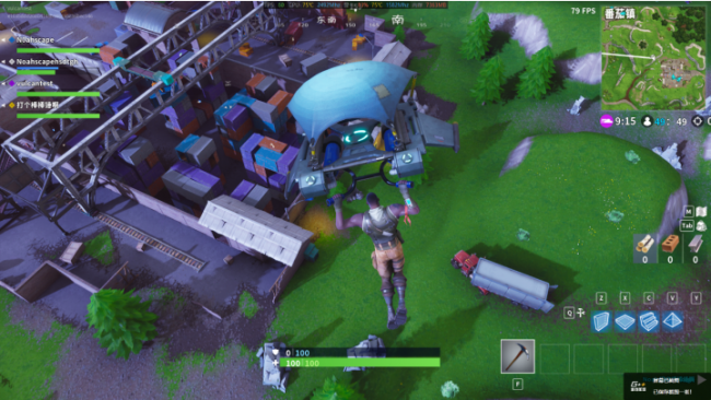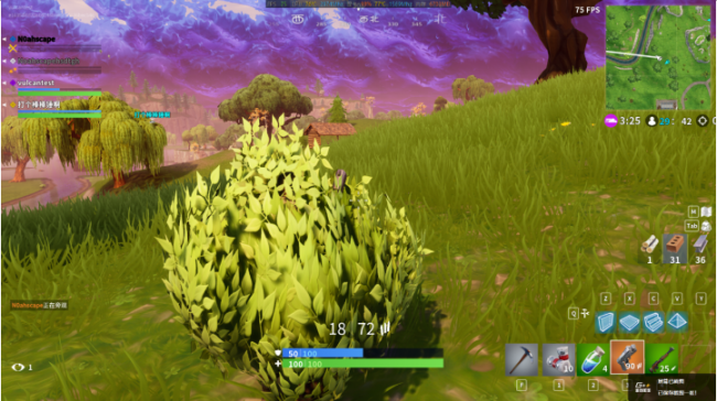 再来看看《堡垒之夜》的吉利服——草垛服,草垛服还是很容易碰到的,不过在使用吉利服的时候需要注意,过快的奔跑、跳跃会使吉利服脱落,受到大量攻击也会导致吉利服脱落!此时的帧数为73fps左右波动。