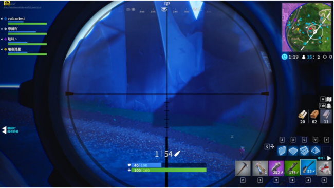 开镜对枪,《堡垒之夜》的开镜是需要持续按右键开始的,如果有甩狙的高手在,估计会喜欢吧?开镜时候帧数为82fps。