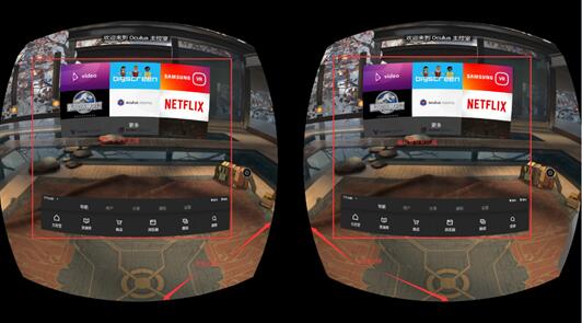 大朋巨幕影院的图形渲染中巧妙的利用了这点,通过利用特殊绘制的Hidden Mesh(隐藏网格),能有效降低GPU的渲染工作量。CPU,GPU并行度提高了,GPU渲染效率也提高了,又进了了一步。怀着好奇心,笔者进一步分析了Oculus Go的系统,也许出于其他的考虑,发现它并没有采用Hidden Mesh。下图红框是Oculus Go Home中用户能够看到的部分,红框之外圆圈之内的内容用户通过透镜和镜杯并不能看到。