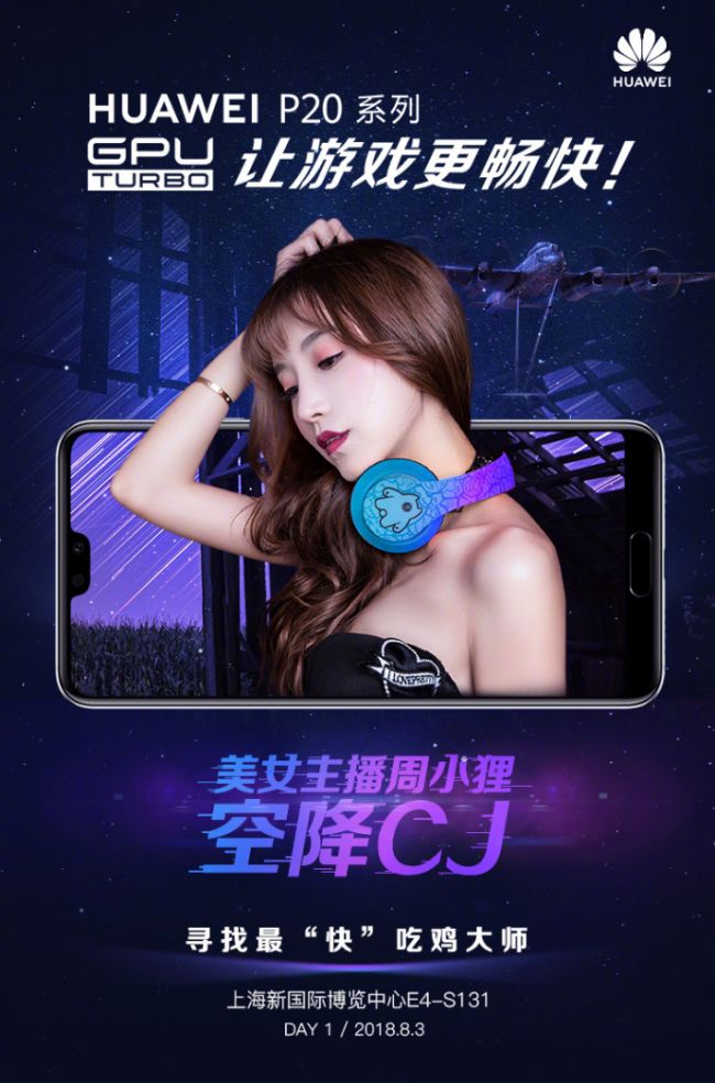 更精彩的是,根据海报上的文案#有GPU Turbo无Trouble 华为P20系列带你决速荒野# 你是足智多谋的战略专家?或者是善于隐匿行踪的狙击高手?如果“吃鸡”对于你而言已经是家常便饭,那么我们在ChinaJoy中关村在线华为P20展台等你,可以猜测展区可能会有实打实的“吃鸡争霸赛”。而且美女主播周小狸也会连续三天对比赛进行直播,让每一位游戏爱好者感受职业竞技选手一样的紧张、刺激,享受成为全场焦点的感觉,至于现场会有哪些民间高手涌现,职业电竞选手会不会慕名而来?获胜者会喜华为P20大奖吗?还得现场揭晓。