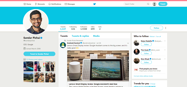 谷歌CEO“劈柴哥”Sundar Pichai,也在他的Twitter主页上转推了《Android Central》关于联想Smart Display的推文,可见“劈柴哥”应该也是体验过后,觉得各方面的表现均十分出色,才会“良心推荐”的吧。