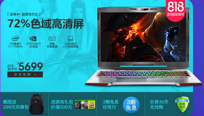 金钢4KA面采用金属拉丝工艺设计+3D水晶发光立体logo,颜值爆表;采用i7-7700HQ处理器、GTX1050Ti 4G独显,可流畅运行各种大型游戏。配备机械键盘,操作得心应手;搭载8G高频率内存,128G固态硬盘+1T机械硬盘,给玩家更快速的操作体验。同时采用了双涡轮风扇+四导热铜管散热组合,更有一键骤冷随时救场,散热性能强劲。采用72%色域IPS高清4K屏,可视角度和色彩还原度极高,画面更加个高清流畅,让你在游戏中占尽先机。极具性价比,活动期间更是价格超值,减小学生用户的购买压力。