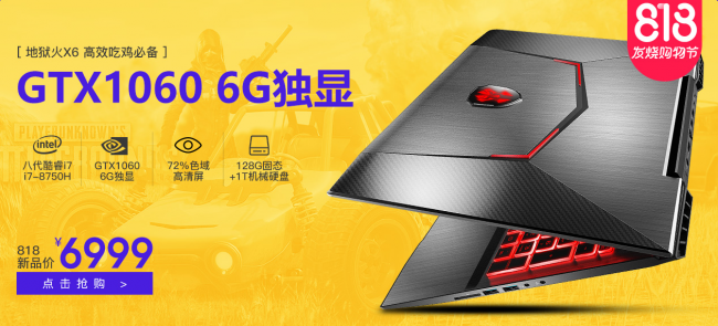 地狱火X6作为1060游戏本中的爆款,A面采用碳纤维纹+金属拉丝纹理工艺设计,外观炫酷个性;采用72%色域IPS高清广视角屏幕,画质高清细腻,还原度极高;搭载i7-8750H处理器、发烧级游戏显卡GTX1060 6G独显,应对各大型游戏不在话下;同时散热性能强劲,一键骤冷+双涡轮风扇双铜管并联散热,快速排出机身热量。此外还搭载了8G DDR4 高频内存,128G固态硬盘+1TB机械硬盘,游戏极速响应,游戏玩家的必备神器。