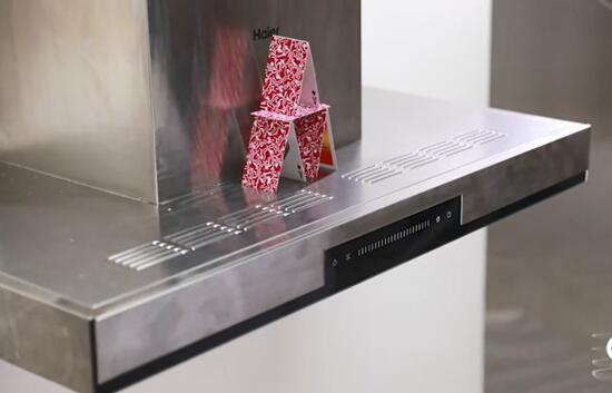 搭过纸牌塔的人都知道,搭纸牌塔的理想环境是平整而摩擦力大的地方,比如毯子上。而海尔风幕8°油烟机的装饰罩材料为了方便清洗,是由不锈钢打造的,表面光滑,摩擦力小。更令人吃惊的是,工作人员随后打开了风幕8°油烟机,并开启了爆炒模式。风幕8°油烟机爆炒模式下的排风量是超大的22m³/min,电机的转速极快,产生的震动远大于中速挡和低速挡。但在视频中我们能看到,在高速运转的吸油烟机上,纸牌塔不倒,海尔风幕8°油烟机的平稳可见一斑。