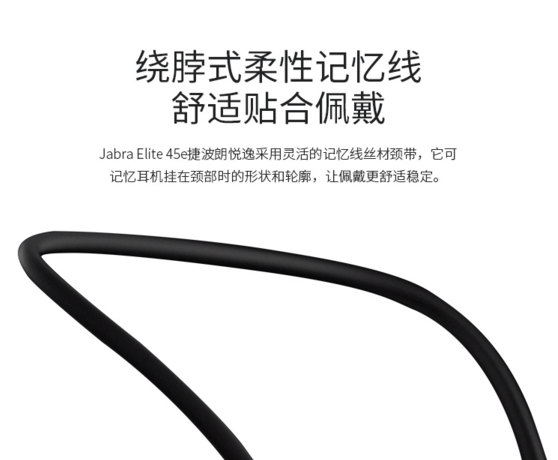 Jabra Elite 45e 悦逸在外观设计方面,有着非常精美的外观和工艺,拥有浑然一体的精美色泽以及坚固耐磨的特性,TA采用灵活的记忆线丝材颈带,免去解开纠缠的耳机线的烦恼,TA还可以记忆耳机挂在颈部时的形状和轮廓,使穿戴更加方便,并且超强抗拉不易缠绕的特性,在日常佩戴和收纳的过程中不易损坏,还有在舒适的佩戴感方面,纷纷赢得了众多粉丝的称赞。