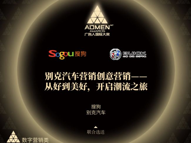 搜狗此次申报作品《别克汽车案例》能够从众多参选作品中脱颖而出,主要依托其“大数据+大流量+强创意”的特色优势,对目标人群形成了全面覆盖,且有效缩短了品牌的触达路径,从而征服了ADMEN国际大奖的组委会和众多评委。
