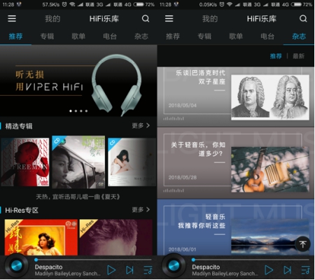 除了音源格式接受度高,在乐库方面,VIPER HiFi也同样不容小觑。其拥有音源丰富的HiFi乐库,分为推荐、专辑、歌单、电台、杂志五大板块,带给听众更多元化的新选择。目前VIPER HiFi乐库已经拥有超过100万张CD专辑和超过10万首Hi-Res、DSD歌曲,且还在不断扩充曲库与版权,保持持续不断地上新歌曲,让你随时走在音乐潮流最前线!