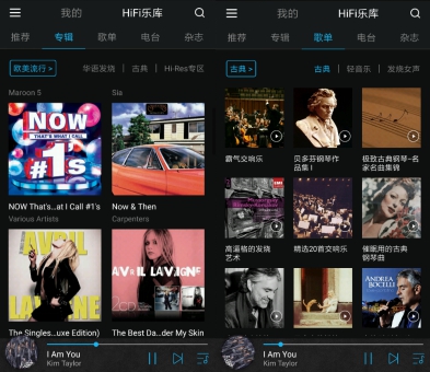 VIPER HiFi 2.0乐库分为推荐、专辑、歌单、电台及杂志五大版块,每个版块各有特色。在专辑、歌单版块中,古典、轻音乐、流行、影视等各类风格音乐一应倶全,用户可以随心选择。值得一说的是,专辑版块专设了Hi-Res专区,进入该专区后还有DSD专辑,为对音质更有追求的用户创造了便利。