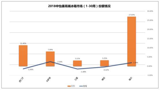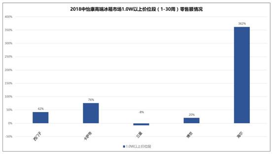 在高端冰箱市场,各高端品牌表现不一。从今年1-30周的市场数据来看,零售额上,行业整体增长1%,西门子、卡萨帝、三星、博世、海尔等品牌在各价位段上均有不同程度的增长。其中1万元以上价位段,西门子增幅42%,卡萨帝增幅76%,三星增幅-8%,博世增幅20%,海尔增幅362%;在1.5万元以上价位段,西门子增幅11%,卡萨帝增幅163%,三星增幅-4%,博世增幅-15%。