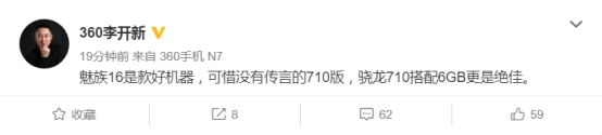 8月8日,360李开新在微博发声:“魅族16是款好机器,可惜没有传言的710版,骁龙710搭配6GB更是绝佳。”不少网友纷纷推测此微博预示着360下一款新品手机将搭载骁龙710,并配备6GB大内存。