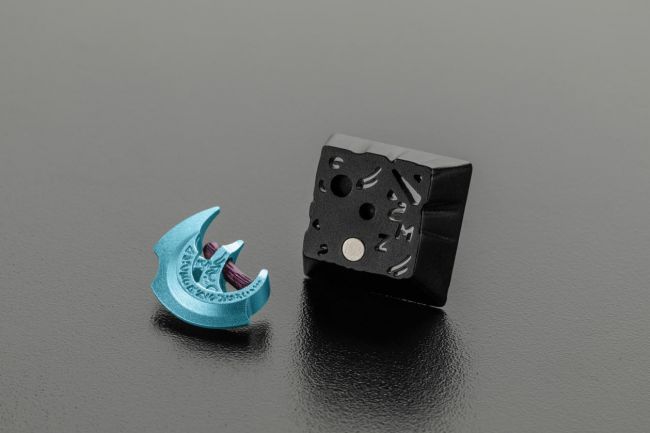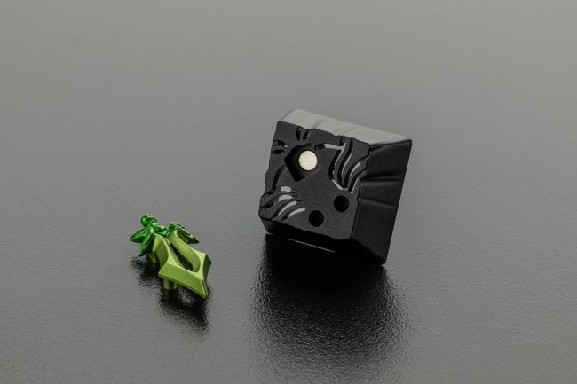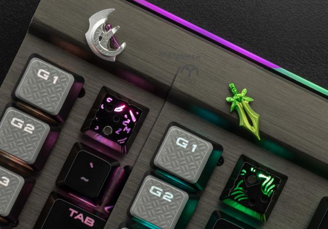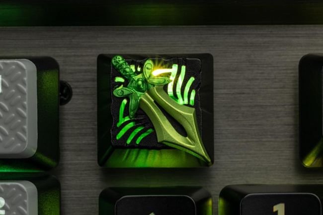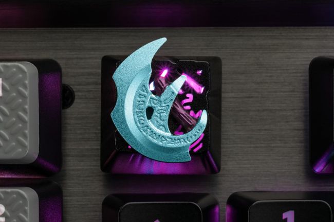 该键帽使用铝合金CNC工艺制作,单颗经20小时工时雕刻而成,历经两次阳极氧化上色预赋予键帽亮丽、不变的色彩。此外,两者都采用了磁吸式结构,可随时将分身斧和蝴蝶刃从键帽中分离,不影响日常的使用。在分身斧和蝴蝶刃的键帽上,有多条透光纹理设计,其纹理设计也非常讲究,灵感来自于官方道具图标,分身斧的右上角的纹理还隐藏着一个DOTA2的logo,当键盘灯光从键帽中渗出时,信仰满分。