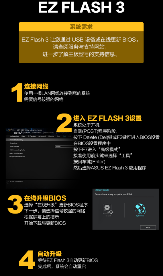 华硕X399系列主板目前支持多种BIOS更新方法,广大用户可根据自己的实际情况选择使用。