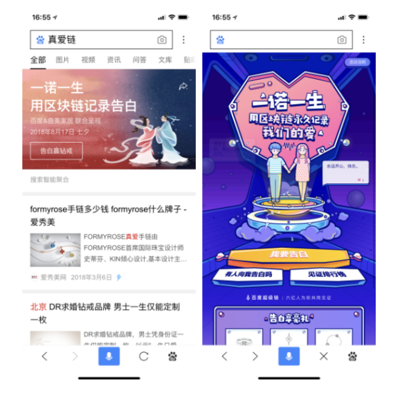 “我想有柏拉图的裘格斯指轮,在你看不见的地方一直陪着你。”每年的七夕节,都是相爱之人大声告白的好时机。今年的七夕节,百度搜索借用技术玩了一把不一样的浪漫,他们联合曲美家居推出了基于区块链技术的“一诺一生”告白活动,无论是你的甜言蜜语还是海誓山盟,都将在这个平台上得到永久记录到区块链中,成为你们爱情的见证。