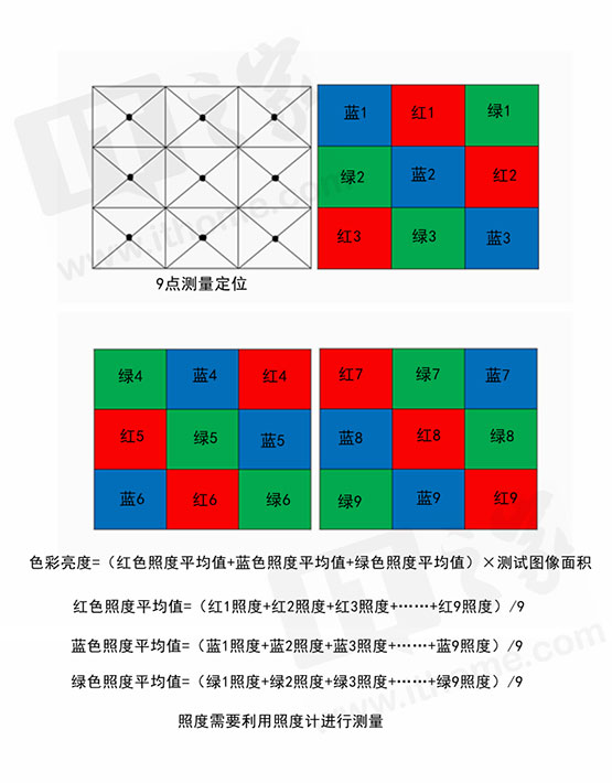 关于色彩亮度的测量,需要分别测试NTSR,NTSG,NTSB 测试图样中(9点测量)每个色块中心点照度值的平均值,与测试图像的面积相乘,即得到色彩亮度。具体测量和计算方法参考下图: