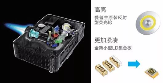 区别于传统的激光组件,爱普生使用更加紧凑的激光二极管集合板设计,在缩小投影机体积的同时输出相同能量,匹配原装反射型荧光轮,有效降低光能损失,实现小巧高亮。