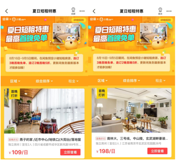 8月22日,小猪短租与阿里巴巴旗下共享经济平台闲鱼宣布达成战略合作,协力为用户打造更安全优质的民宿短租体验。小猪将全量向闲鱼输出其国内房源,双方还将在智能化体系建设、房源及产品运营等方面展开密切合作,推动房屋住宿共享平台的下一步创新。目前,双方已联合开启了为期三周的市场活动,用户通过闲鱼预订小猪短租房源,可享受“连订3晚首晚免单,连订2晚首晚5折”的优惠。