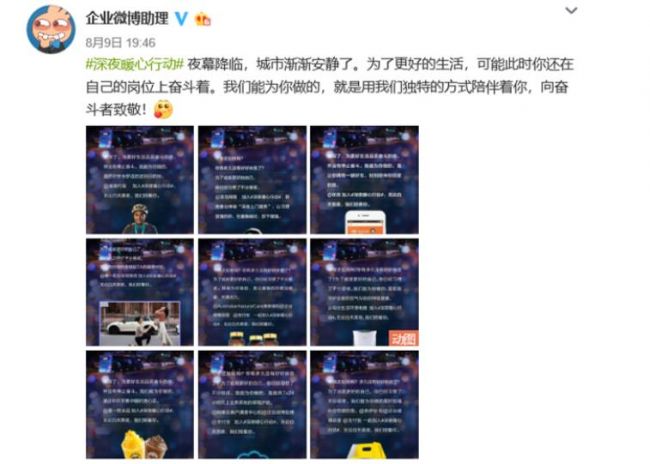 #深夜暖心活动#凭借企业蓝V的聚集声量发挥了重要的影响力,相关大数据也成为了品牌企业今后进行精准营销的有力支撑,完整诠释出“以蓝V之力,让世界更美”的意义。今后,微博还将一如既往大力支持蓝V通过微博平台开展各项营销活动,并倾其资源,引导企业用户能够正向、积极的运营。
