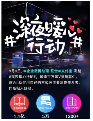 8月22日,由微博与支付宝联合发起的#深夜暖心行动#完美收官。自8月9日上线起,活动在微博的大力推动下得到多家企业的支持以及微博网友的深度参与。短短两周时间里,有超过1200家企业参与到活动中,#深夜暖心行动#话题的阅读量超过1.1亿,话题讨论量超过5万。