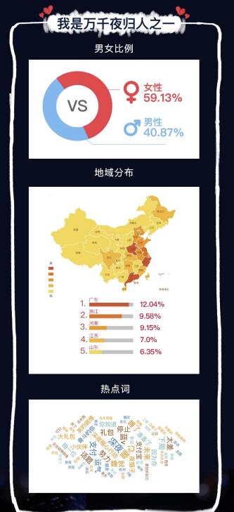 在活动尾声,微博根据参与活动的粉丝大数据,首次对“夜归人”进行可视化数据分析。结果发现,“夜归人”中女性占据59.13%,广东、浙江、河南三地摘得地域分布前三甲,品牌关键词在热点词中多次出现。