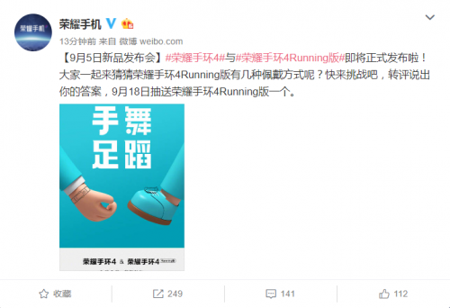 今天(8月27日),荣耀官方微博公布了即将发布的新品手环名称:「荣耀手环4 Running版」。从命名来看,“Running”译为“奔跑”,这也进一步印证了新品手环会专攻更专业的跑步领域。