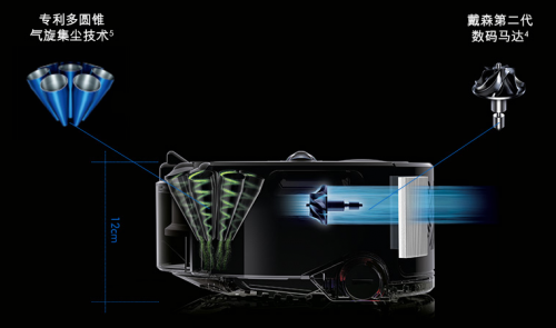 戴森360Eye扫地机器人植入戴森专利第二代数码马达和8个圆锥气旋,戴森专利第二代数码马达,拥有每分钟78,000转的转速,媲美戴森v8 的吸力,深度全面清洁家中。经过精密计算设计的8个小巧气旋产生恰到好处的高速气流,并通过离心力,将灰尘风力甩入集尘中,不易堵塞气道。