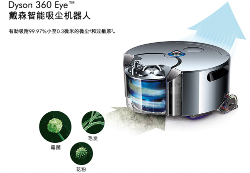 戴森360Eye扫地机器人采用整机过滤系统,有效吸除99.97%小至0.3微米的微尘和过敏原,排出洁净空气,不扬尘,不会造成二次污染。干净利落,呵护家人健康。戴森360Eye扫地机器人整机密封,让粉尘无缝可逃,不止于吸,重新定义“有效清洁”。