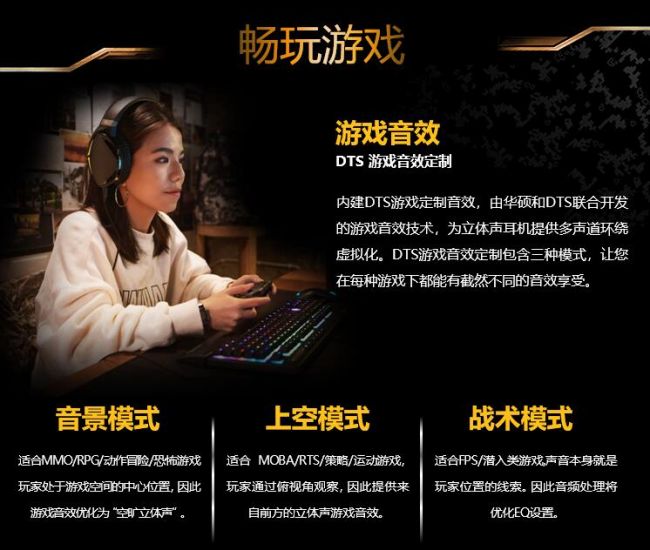 值得一提的是,它在高品质板载声卡的基础上特别新增了DTS游戏音效定制技术。这是华硕携手DTS联合开发的游戏音效技术,为立体声耳机提供多声道环绕虚拟化。让玩家可根据游戏类型,将音效偏好设为航空模式(适合MOBA/RTS/策略/运动游戏),音景模式(适合 MMO/RPG/动作冒险/恐怖游戏)和战术模式(适合 FPS/潜入类游戏),进而带给玩家更逼真、更震撼的游戏音效或更精准的声音定位。
