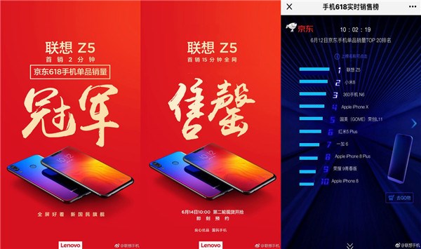 自6月5日发布之日起,以其超高的性价比备受用户关注。联想Z5定位千元机,火力全开。正式开售当天,2分钟即力压荣耀play和小米8,一举创下15分钟全网售罄的记录,跃居京东手机单品榜TOP1。6月14日10时,联想Z5第二轮售卖5分钟即告罄,联想K5 play、联想K5和联想Z5三款手机分别占据京东手机单品销量排行榜第一、第四和第五的位置。京东“618”大促当天,联想手机在京东手机销量品牌榜中排至第五位,在手机销售额品牌榜和1日-18日累计销量品牌榜中均排名第六,声势直逼小米、荣耀、苹果和华为。