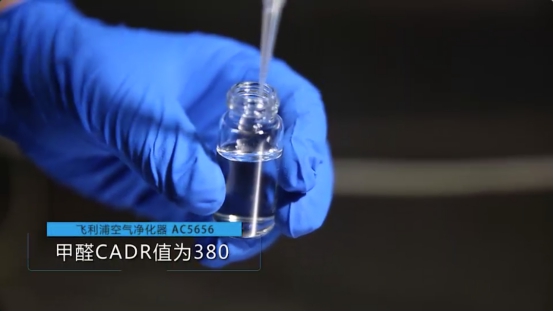 实验首先检测产品的CADR值(洁净空气量),CADR是净化能力的参数,能够直接、科学反映空气净化器的真实净化能力,数值越大能力越强。飞利浦5000系列空气净化器的CADR值检测为380 m³/h,高于产品标称的300m³/h。即使在同类产品中,飞利浦5000系列空气净化器的CADR值也是超前的。