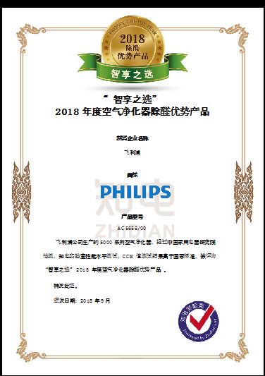经权威评测,飞利浦5000系列空气净化器凭借优于国标的除醛性能获得“智享之选”2018年度空气净化器除醛优势产品。