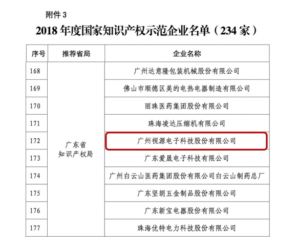 日前,国家知识产权局公布了2018年度国家知识产权示范企业和优势企业名单。视源股份(CVTE)被认定为“国家知识产权示范企业”,旗下子公司视睿科技成功入选“国家知识产权优势企业”。本次评审公布的2018年度国家知识产权示范企业全国共234家,广东省入选企业27家,广州市入选企业仅3家,视源股份是其中一家。