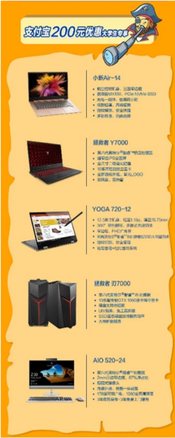 1. 学生在支付宝认证,即可享有200元购机优惠券。(支持机型:联想小新Air 14、拯救者Y7000低色域版、YOGA720-12、拯救者刃7000、AIO 520-24五款机型)