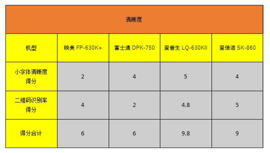 通过上表可以看出,爱普生LQ-630KII、爱信诺SK-860的二维码通过率较高,在清晰度方面有着不错的表现。故此,我们不难对四款产品进行打分。