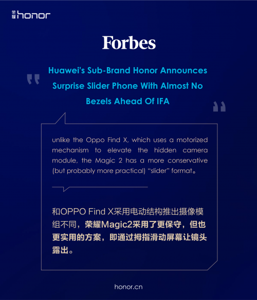 而在面对Magic2与OPPO Find X雷同的质疑声中,全球权威商业媒体《福布斯》(Forbes)毅然发声,客观强调:“与OPPO Find X采用的电动结构推出摄像模组不同,荣耀Magic2采用了更实用的方案”。
