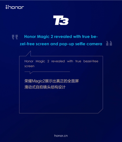 在国内媒体狂欢点赞后,荣耀Magic2收到海外媒体自发好评。“荣耀Magic2采用了真正的全面屏和滑动式自拍镜头设计”。全球首屈一指的时尚数字科技网站T3对荣耀Magic2的真正全面屏设计表示了认可。