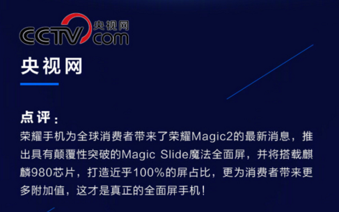 其中,央视网点评:荣耀手机为全球消费者带来了荣耀Magic2的最新消息,推出具有颠覆性突破的Magic Slide魔法全面屏,并将搭载麒麟980芯片,打造近乎100%的屏占比,更为消费者带来更多附加值,这才是真正的全面屏手机!