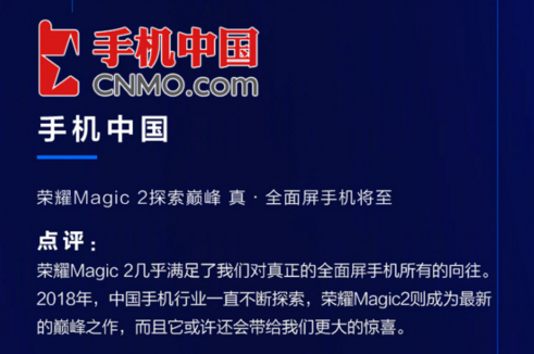 手机中国则认为,荣耀Magic 2几乎满足了我们对真正的全面屏手机所有的向往。2018年,中国手机行业一直不断探索,荣耀Magic 2则成为最新的巅峰之作,而且它或许还会带给我们更大的惊喜。