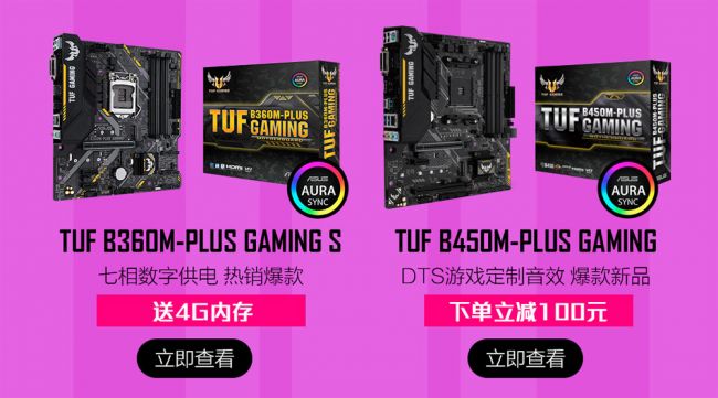 此次活动,特向大家力推华硕TUF B360M-PLUS GAMING S与TUF B450M-PLUS GAMING爆款主板。它们均隶属于TUF GAMING电竞特工系列,喜欢电竞游戏、追求高性价比的玩家们一定要多多关注一下。