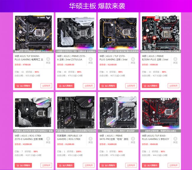 在“华硕主板 爆款来袭”专区,共有八款人气主板参与其中,包括五款Intel 300系主板TUF B360M-PLUS GAMING、PRIME Z370-A、TUF Z370-PLUS GAMING、ROG STRIX Z370-E GAMING和TUF B360-PLUS GAMING S,Intel B250销量冠军PRIME B250M-PLUS主板以及两款AMD 400系主板ROG STRIX B450-F GAMING、PRIME X470-PRO。它们均拥有华硕诸多独家先进技术,可提供卓越的性能表现,且各具功能特色以及美学设计,能够满足不同需求的DIY硬件玩家以及电竞游戏玩家。