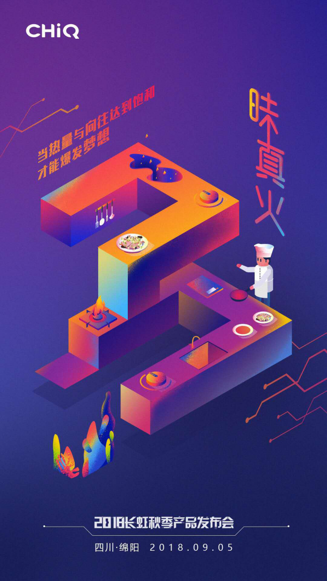 长虹自媒体平台,官方微信上发布的海报也是如此,这张发布会活动海报以一位大厨做菜为图案,主题文案只有三个字:味真火。按照正常逻辑,海报上这种规模级别的厨房多为企业级后厨,企业级后厨通常应该是多名厨师一起工作。然而海报上只有一名厨师,让人对长虹的新品发布会充满想象。