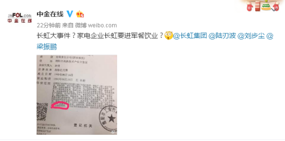 9月3日,中金在线官方微博晒出长虹营业执照。营业执照上,经营范围中“餐饮服务”一词被圈红标注,暗指与即将到来的9月5日“大事件”有某种关联。
