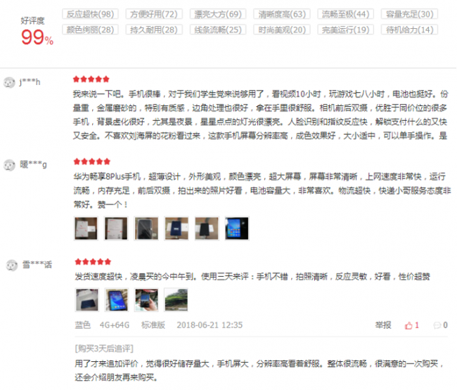 (华为畅享8 Plus京东商城好评截图)