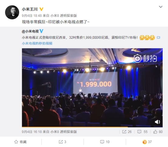 在印度当地第一大电商网站Flipkart 7月数据显示,小米电视拿下该平台56.6%的市场份额,而在印度整体电视市场份额小米电视已超过10%。继小米电视进入印度后,印尼市场成为第二个重点开展业务的国家。随着海外市场的快速扩张,小米电视所坚持的“做世界上最好的电视,让每个人都买得起”的理念,也正在全球化的道路上中不断践行,惠及全球更多的米粉家庭。
